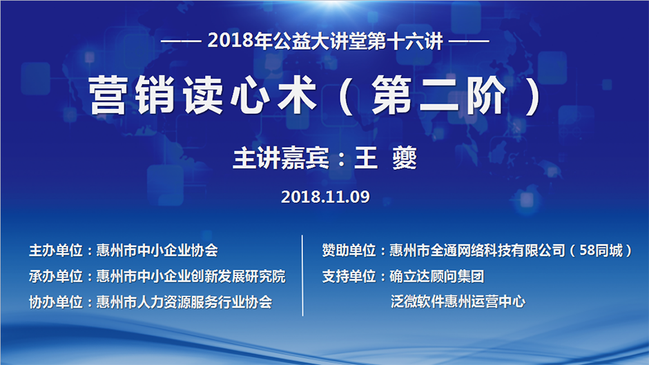 2018年11月9日下午由惠州市中小企业协会主办、惠州市中小企业创新发展研究院承办、惠州市人力资源服务行业协会协办的2018年公益大讲堂第十六讲课程在市中小企业协会会议室火爆开讲,课程由惠创院签约顾问老师王夔讲授,现场座无虚席,来自全市各行业的180多位企业家代表和企业高管参加了学习。