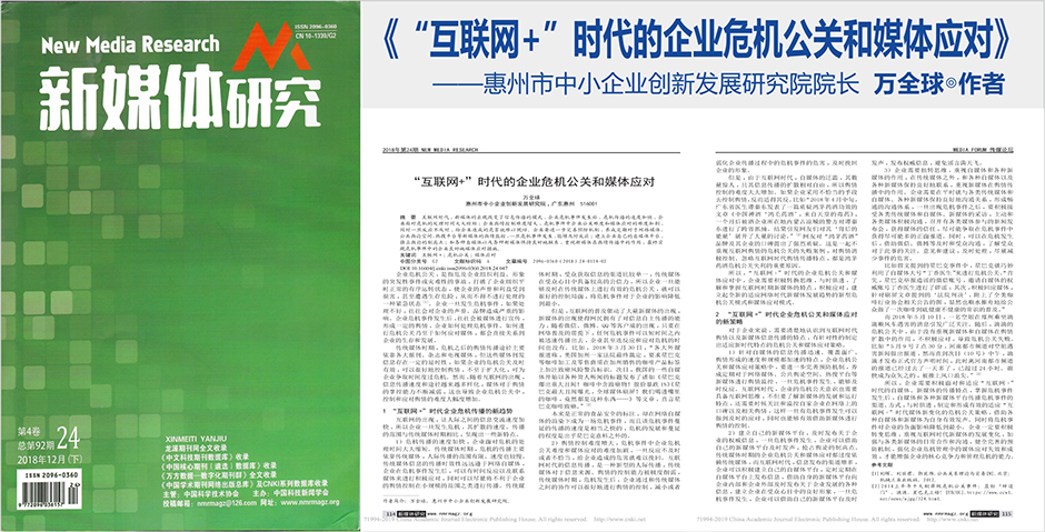 为此,惠州市中小企业创新发展研究院院长万全球经过深入的研究,撰写了《“互联网+”时代的企业危机公关和媒体应对》学术论文,2018年11月被国家级期刊《新媒体研究》录用,于2019年01月正式发表。