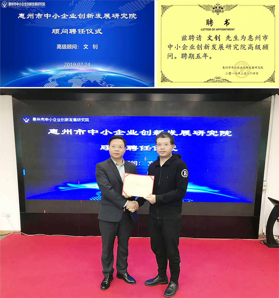 聘任仪式上,万全球院长分别给文钊、王靖雯、左学敏三位专家颁发了惠创院“高级顾问”聘书。