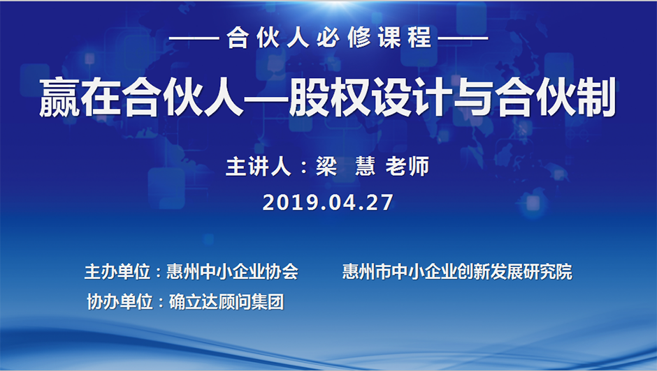 4月27日,由惠州市中小企业协会、惠州市中小企业创新发展研究院主办,确立达顾问集团协办的《赢在合伙人--股权设计与合伙制》精品课程在协会会议室成功举办。