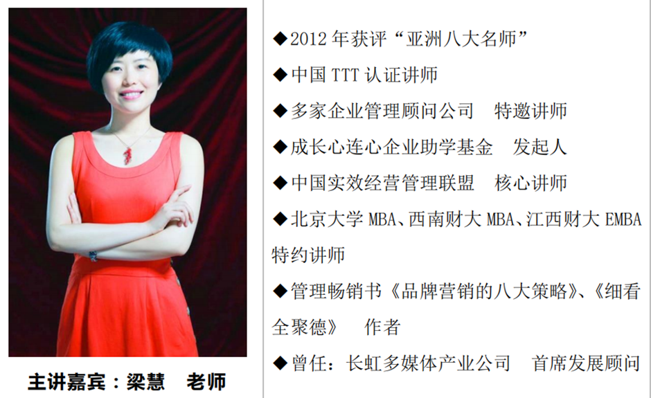 本次课程由中国实效经营管理联盟核心讲师、北京大学MBA、西南财大MBA、江西财大EMBA特约讲师、2012年获评“亚洲八大名师”、管理畅销书《品牌营销的八大策略》《细看全聚德》作者梁慧老师主讲,来自惠州、深圳及周边地区,多个行业的企业家、企业高管、企业经理共40多人参加了此次培训。