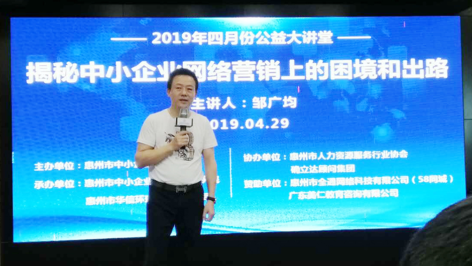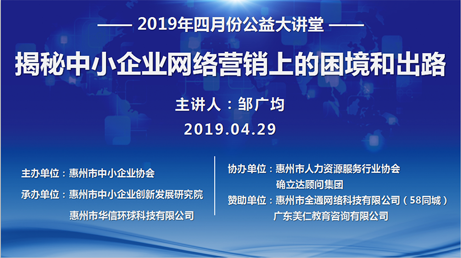 2019年4月29日下午,由惠州中小企业协会主办,惠州市中小企业创新发展研究院与惠州市华信环球科技有限公司联合承办的《揭秘中小企业网络营销上的困境和出路》公开课在中小企业协会7楼会议室火爆开讲!来自各行各业将近100位企业家和高管人员,一起聆听中小企业网络营销上的困境和出路,不断通过网络营销实现一个自我的创新!