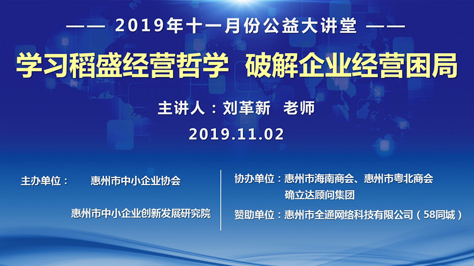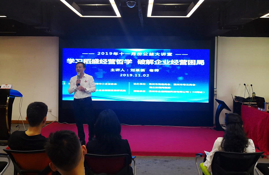 2019年11月2日下午14:00,由惠州市中小企业协会、惠州市中小企业创新发展研究院主办,惠州市粤北商会、惠州市海南商会、确立达顾问集团协办,58同城招聘网惠州独家授权合作商“惠州市全通网络科技有限公司”赞助的《学习稻盛经营哲学 破解企业发展困局》公益课在协会会议室举办,来自多个行业的80多位企业家代表前来聆听学习。