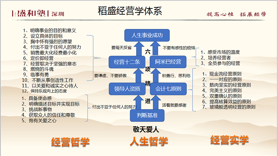 刘老师授课要点如下:提升企业业绩的经营要诀是什么?只有一条,就是经营者自身要反复学习哲学,将哲学血肉化。与此同时,还要努力与员工共同拥有这种哲学,除此之外别无它法。稻盛和夫相信这个法则,并在经营企业的过程中,努力实践这个法则。多做好事,能使命运朝着好的方向转变,能使自己的工作朝着好的方向转变。“盛和塾”帮助企业家提高心性、拓展经营,实现员工物质与精神两方面的幸福,助力中华民族伟大复兴,促进人类社会进步发展。