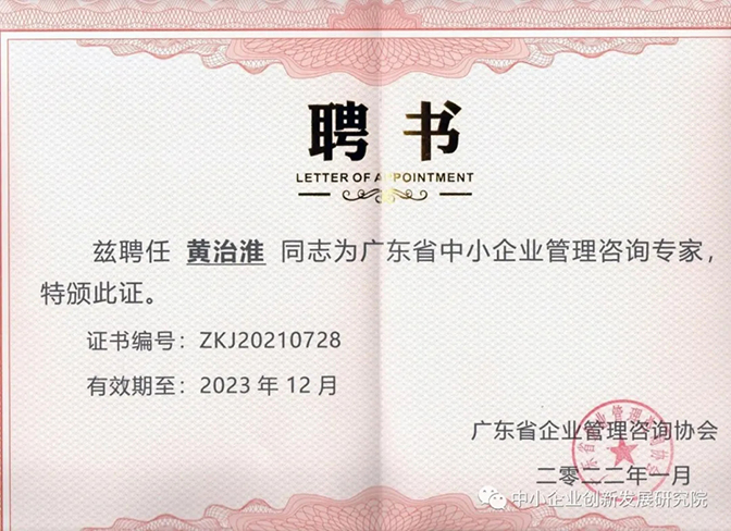 我院理事长黄治淮获聘广东省中小企业管理咨询专家