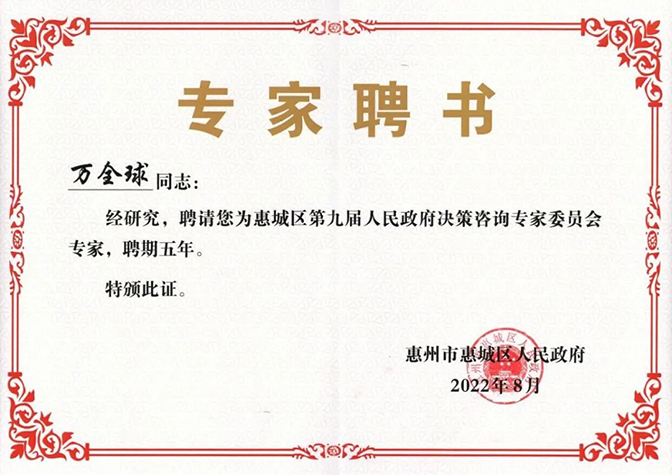为落实《关于完善区政府决策咨询专家委员会工作机制的通知》(惠城府办〔2022〕6号)文件精神,惠城区人民政府公开向全社会遴选第九届惠城区人民政府决策咨询专家委员会专家,组建专家库,主要围绕惠城区经济社会发展相关重大问题开展咨询论证工作,为区政府依法决策、科学决策、民主决策提供依据。经遴选、审核、公示等环节,惠城区人民政府聘请了我院院长万全球等90名专家为惠城区人民政府决策咨询专家委员会专家,聘期为5年。