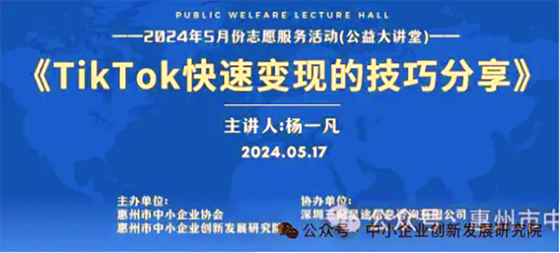 2024年5月17日,我院联合惠州市中小企业协会在奥林匹克花园成功举办了2024年5月份志愿服务活动——《TikTok快速变现的技巧分享》。特邀深圳三藏星途信息咨询有限公司高级讲师杨一凡老师,为大家解读TikTok快速变现。