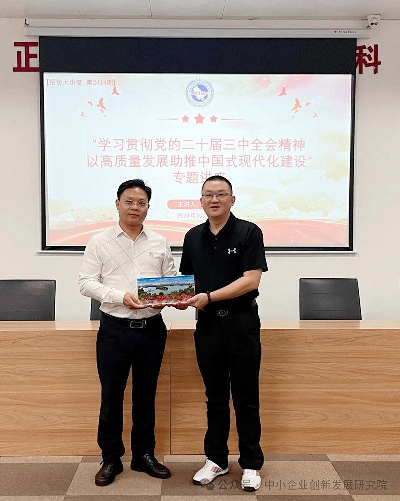 为深入学习贯彻党的二十届三中全会精神,把深化改革的战略转化为中小企业转型升级动力,促进惠州社会经济高质量发展,为中国式现代化贡献力量。2024年10月30日下午,我院院长万全球受惠州市招标投标行业协会邀请,在其党员活动室作了“学习贯彻党的二十届三中全会精神 以高质量发展助推中国式现代化建设”专题讲座,该协会协会十月份轮值会长曹恋沙及协会企业等30多人参加。