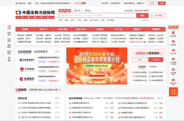 网络交易平台,为用户提供规范,安全、高效、完善的全程在线招投标、采购询价竞争、拍卖等服务。其年发布招投标数据信息和工程建设项目数据信息量超过4000万条,每年为70多个行业出具各类大数据分析报告。网站注册会员超180万家,日浏览量超过400万次,每年采集的招投标大数据涉及招标采购的规模超过10万亿元人民币。 网站以小垂直、大门户、覆盖全过程工程咨询业务链条为运营逻辑,打通资讯、行业服务、平台交易、人才培养通路,为行业各参与方打造综合服务门户平台。服务体系涵盖招投标商机发布与查询、项目及采购信息订阅解决方案、AAA企业信用等级认证服务等多种产品。此外,还为多家央企国企建设企业独立电子招标采购交易平台,公司企业数智化转型赋能服务体系载体为一键商成平台,助力企业实现全供应链数字优化和转型。