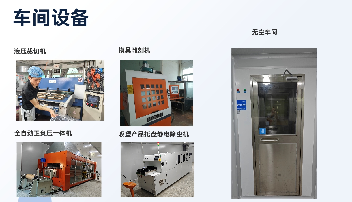 - 产能配置:布局11条生产线(含7条全自动线),配套无尘车间、吸塑托盘静电清洗机、自动裁切机等先进设备,实现“片材加工→吸塑成型→成品裁切”全流程自动化,日均产能覆盖 5万+件 吸塑制品;