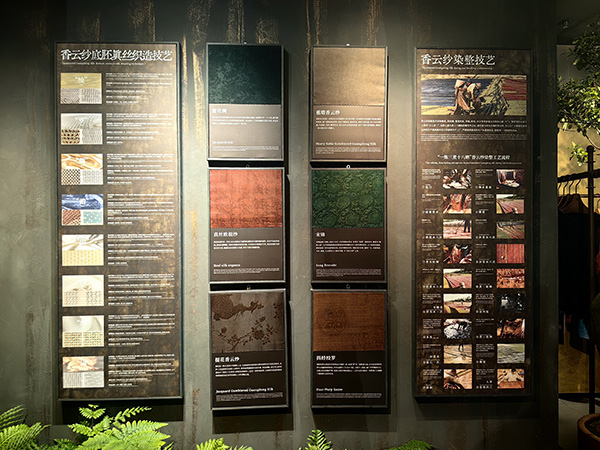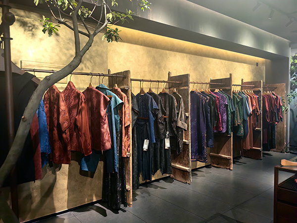 一楼「易见」香云纱专区:藏着老手艺的新韵味。6A级重段香云纱老料,温润厚实,越穿越有光泽,男女同穿各显风骨;六重纬老宋锦,经纬扎实挺括,自带沉稳气质;四经绞罗手工织造,透光透气如“会呼吸的屏障”,老辈称“空调衣”。拼接处藏巧思,欧根绡搭宋锦八达晕纹,手绣随纹样流转,连内里红绫都织着细腻银丝,需得仔细养护才留得住这份精致。