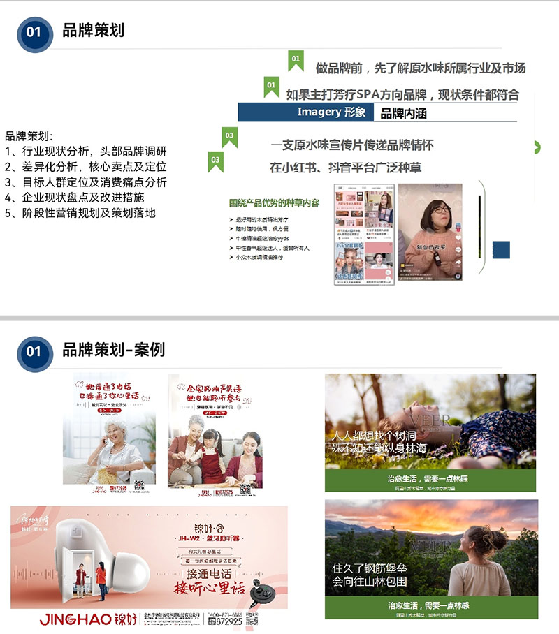 ▶ 品牌策划:从洞察到落地的创意引擎 - 提供“行业分析→差异化定位→目标人群拆解→现状优化→阶段性营销”全流程方案,如为“原水味”品牌打造疗愈SPA赛道定位,通过小红书、抖音种草实现声量破圈;为“锦好”助听器策划“暖心沟通”主题营销,在情感共鸣中强化品牌认知。