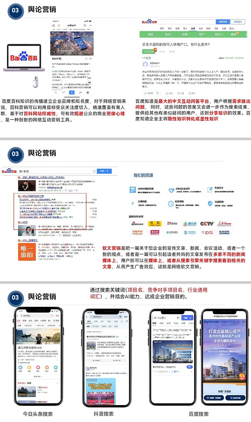 ▶ 新闻舆论营销:用权威声量塑造品牌信任 - 布局百科营销(百度百科/知道)、软文传播、多平台搜索优化,联动央视、人民网等权威媒体,为企业构建“知识科普+舆论引导”的信任体系;通过AI技术优化关键词布局,让品牌信息在今日头条、抖音、百度等平台精准触达目标人群。