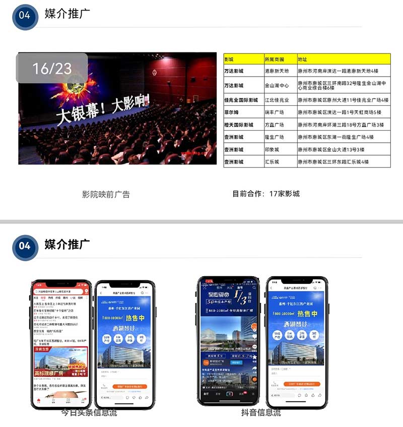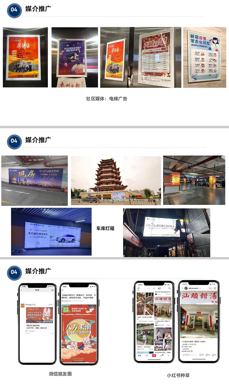 ▶ 媒介推广:线上线下全域触达 - 线下覆盖电梯广告、车库灯箱、17家影院映前广告,线上打通微信朋友圈、小红书种草、今日头条/抖音信息流,形成“社区场景+商业场景+社交场景”的立体传播网络,让品牌信息无死角渗透。