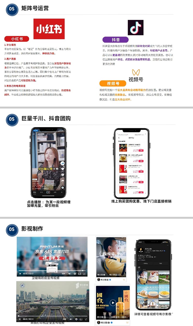 ▶ 新媒体运营及影视制作:内容即生意 - 矩阵号运营(小红书、抖音、视频号)+ 巨量千川/抖音团购,实现“内容种草→线上转化→线下核销”的闭环;影视制作团队为卫健局、奔图打印等打造宣传片,用视觉语言讲好品牌故事。